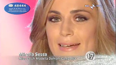 Insomma Mirella non ride mai, neppure quando è strettamente necessario come nelle foto ufficiali di Miss Italia o le inquadrature di rito in tv. Il problema è che ha un sorriso veramente orrendo che avrebbe tolto moltissimi punti alla sua scalata. Probabilmente ha anche un modo di mettere le labbra che accentua la negatività del sorriso stesso e si vede che lei ne soffre molto, perchè tenta in tutti i modi e in ogni situazione, di trovare alternative valide al sorriso classico. Nel post dell’altro giorno avevo anche evidenziato nei commenti, le orecchie a sventola abbastanza pronunciate sempre nascoste dai capelli. Ecco, questi sono i motivi per cui l’altra sera speravo non vincesse lei. Ecco invece Maria, sempre nello scantinato. Tutta un altra storia!!!Comunque volevo tornare velocemente sul retro palco che si vede in queste foto. Ma è veramente scandaloso!!