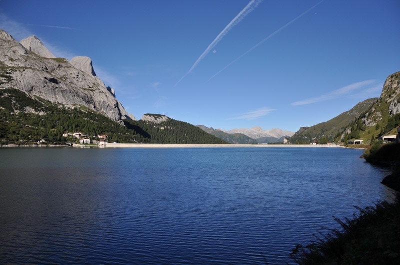 Il lago e tutto il massiccio della Marmolada e del Gran Vernel (a destra).